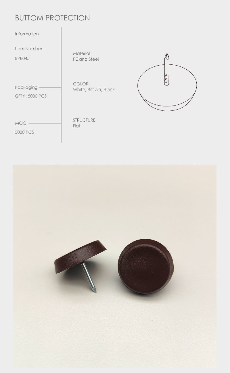 Название брендаJinheДиаметр26mmДлина гвоздя16mmРазмер26*6*16mmОсновной материалУглеродистая сталь + пластикТипПластиковая накладкаЦветБелый, коричневый, черный, настраиваемыйФункцияЗащитная накладка для ножек мебелиОбласти примененияДеревянная мебель / деревянные стулья, столы, письменные столыРекомендуемые товарыИнформация о компанииСертификатыЧасто задаваемые вопросы